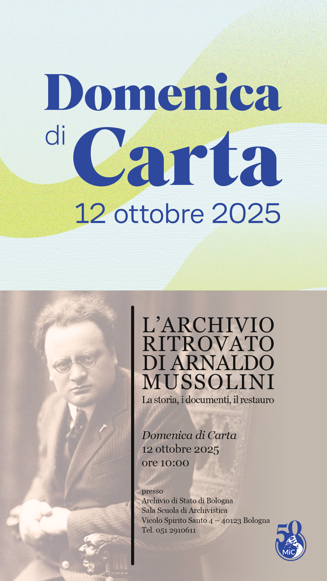 La Soprintendenza archivistica e bibliografica dell’Emilia-Romagna propone, nell’occasione, la presentazione dell’archivio privato di Arnaldo Mussolini (1885-1931), dichiarato di notevole interesse storico nel settembre del 2018. L'archivio (conservato a Paderno di Mercato Saraceno, luogo anche di sepoltura di Arnaldo) è testimonianza viva della vicenda umana e politica del fratello di Benito Mussolini ed è costituito da documenti, materiali fotografici, pubblicazioni oltre alla raccolta del quotidiano "Il Popolo d'Italia" nel decennio, circa (1922-1931), in cui fu diretto dallo stesso Arnaldo.