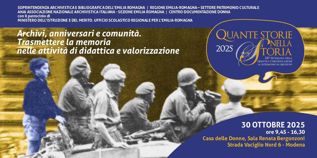 In programma giovedì 30 ottobre alle ore 9,45 presso la Casa delle donne di Modena (Strada Vaciglio Nord,6) il Seminario “Archivi, anniversari e comunità. Trasmettere la memoria nelle attività di didattica e valorizzazione” organizzato da Soprintendenza archivistica e bibliografica dell'Emilia Romagna, Regione Emilia-Romagna - Settore Patrimonio culturale, ANAI Associazione nazionale archivistica italiana - Sezione Emilia Romagna e Centro documentazione donna di Modena.