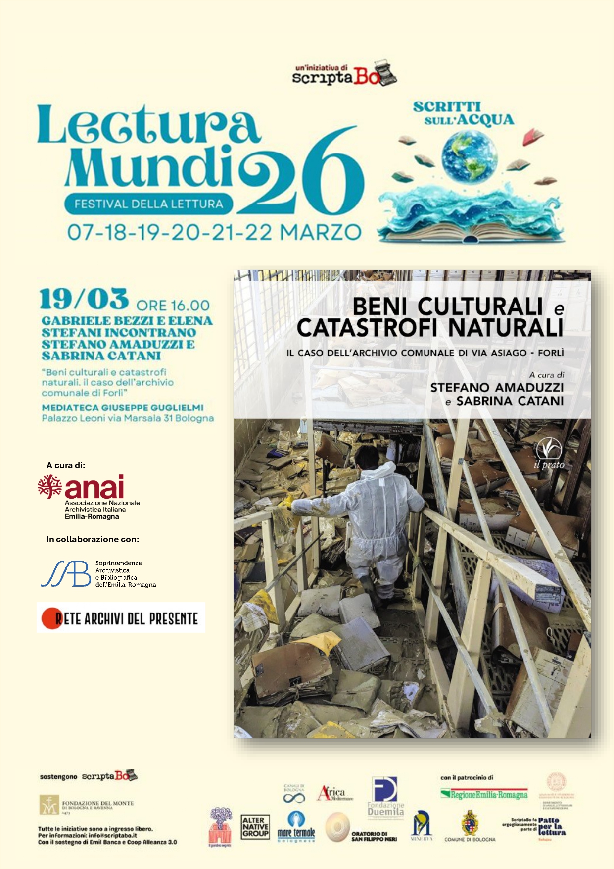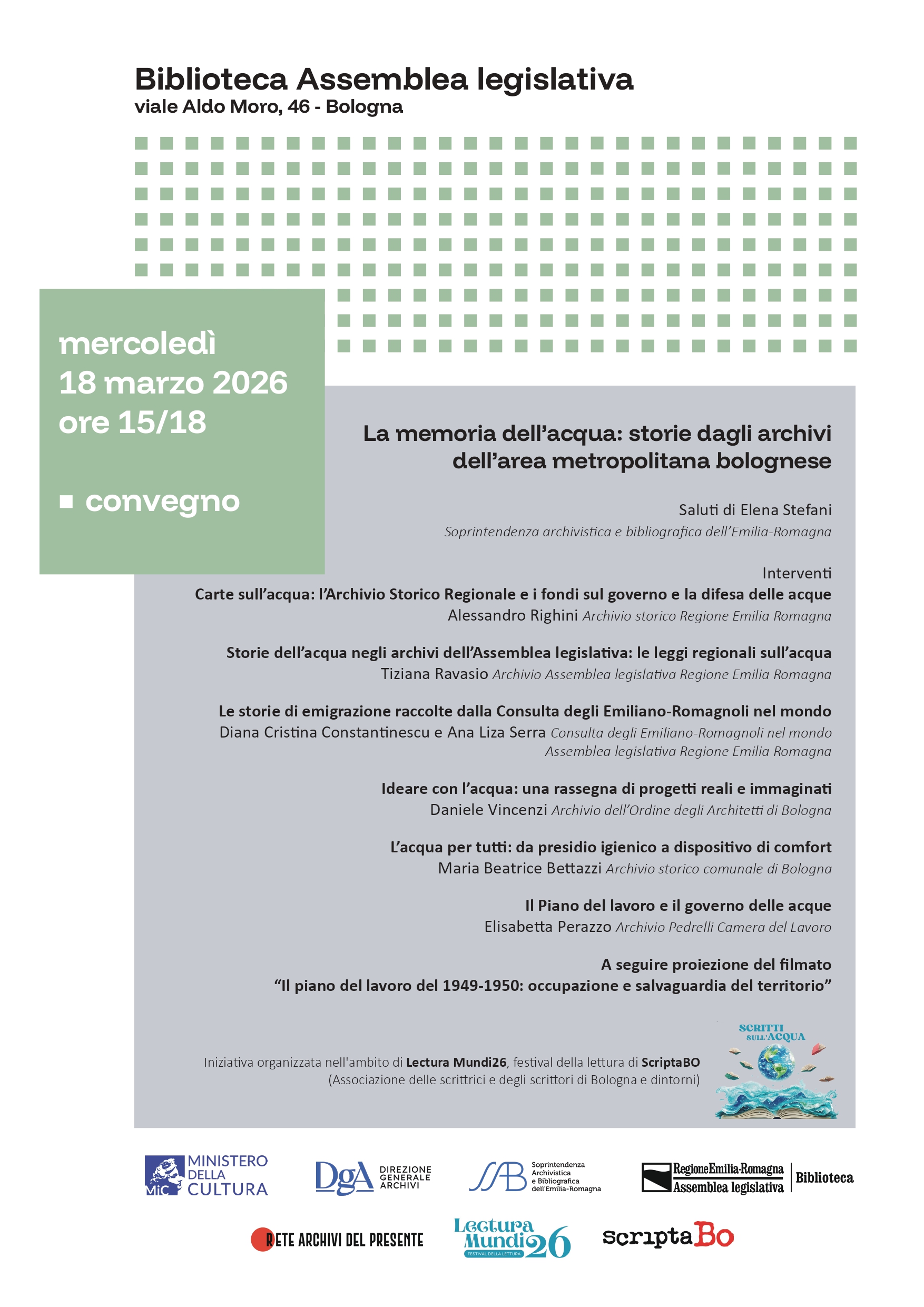 Nell’ambito della terza edizione del Festival Lectura Mundi, in programma dal 7 al 22 marzo 2026, dedicato quest’anno al tema “Scritti sull’acqua”, la Soprintendenza archivistica e bibliografica dell’Emilia-Romagna e la Rete “Archivi del presente” partecipa a due eventi, in programma mercoledì 18 e giovedì 19 marzo 2026.
